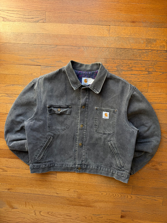 Faded Black Denim Aztec Lined Carhartt Detroit Style Chore Jacket - Large